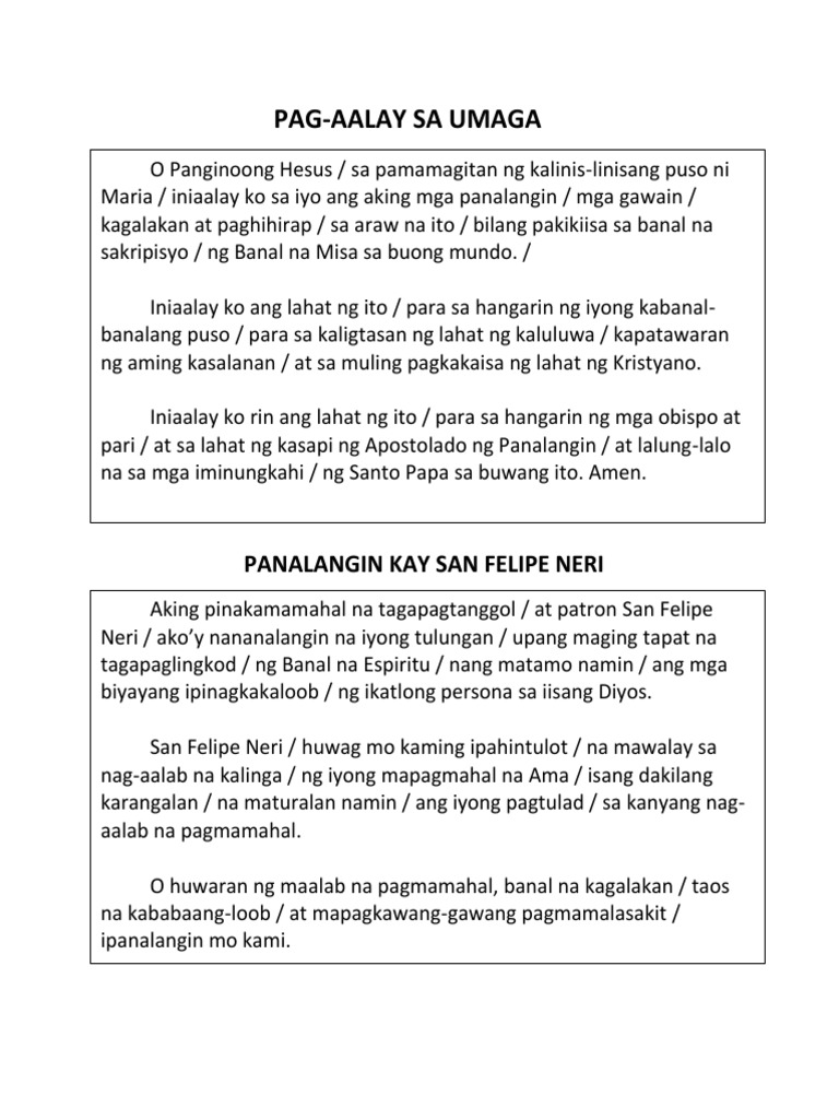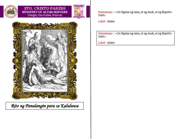 Isang artikulong nagpapaliwanag sa paraan ng pag-alay ng dasal para sa patay maiksing artikulo ngunit malinaw sa wikang tagalong. PANALANGIN PANGKALAHATAN Manalangin tayo sa Makapangyarihang Ama na bumuhay kay Hesus sa mga patay at nagbibigay ng bagong buhay sa ating marupok na katawan. 10312019 PANALANGIN SA MGA KALULUWA Matandang Edisyon Isinaayos ni.