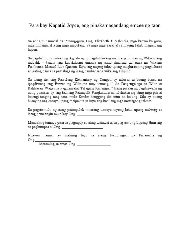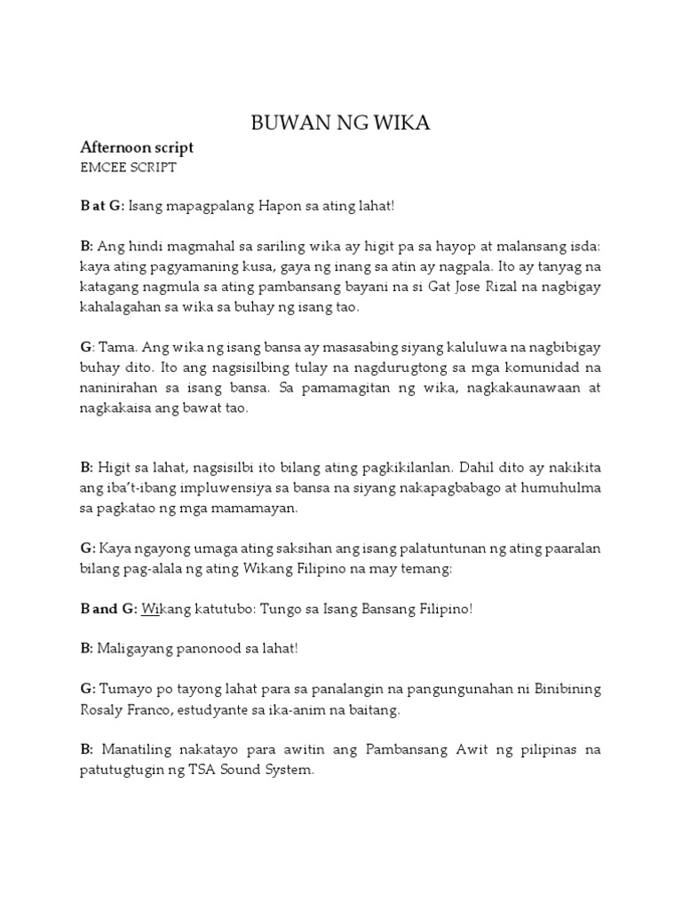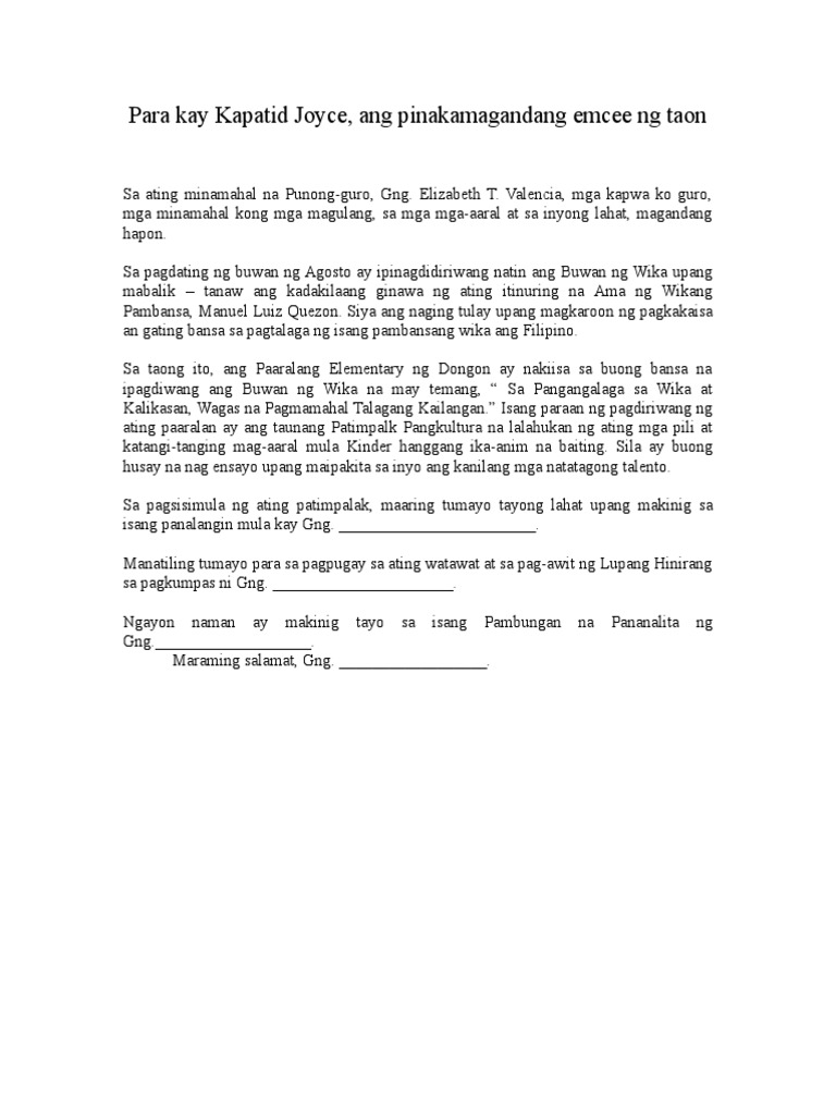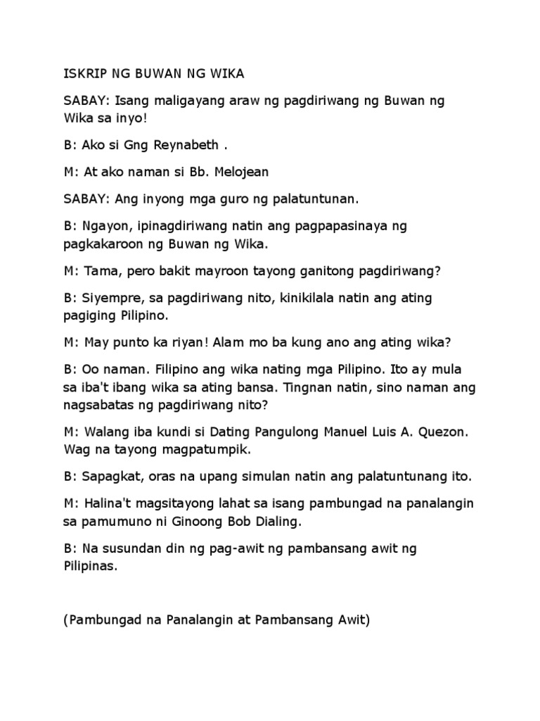 Scribd es red social de lectura y publicacin ms importante del mundo. 21 found this document not useful Mark this document as not useful. Salamat po at kami ay muli mong tinipon sa mahalagang araw na ito upang ipagdiwang ang Buwan ng Wika.