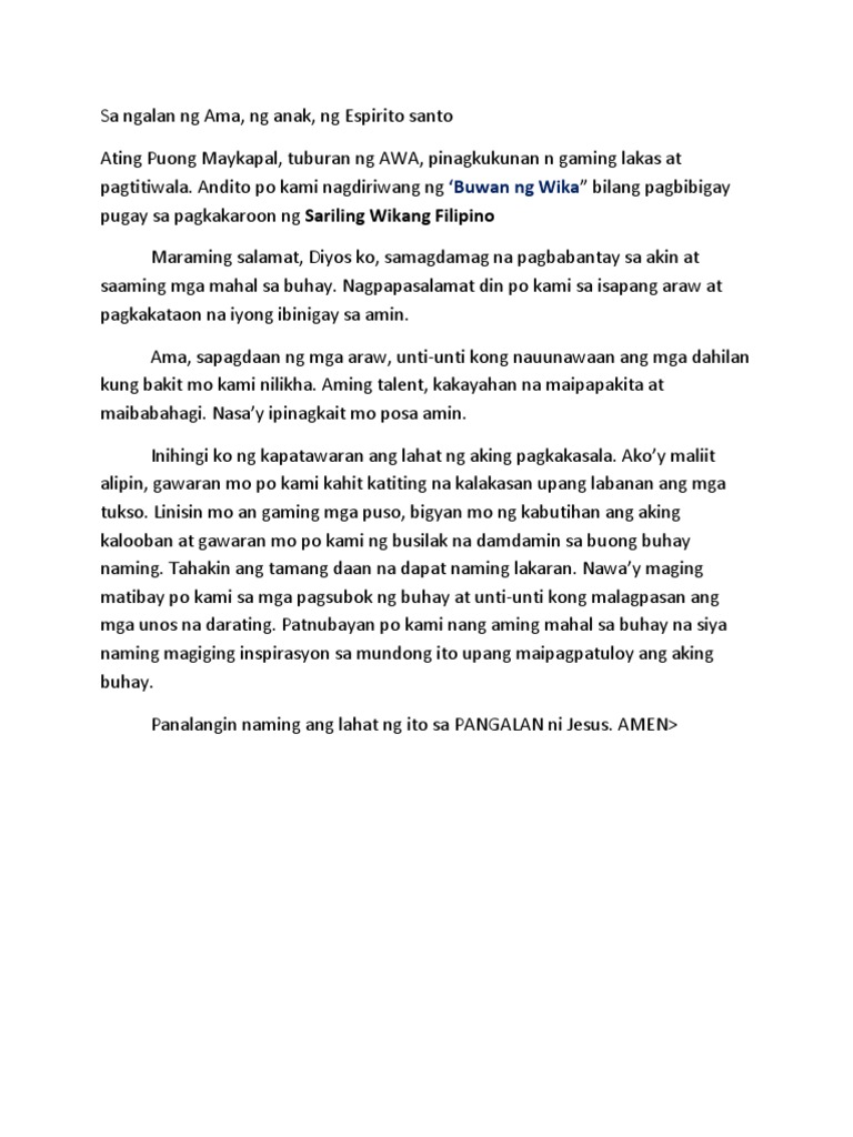 Kayo po ang gumagabay sa lahat ng pananaliksik para sa kaunlaran ng Iyong bayan. PANALANGIN PARA SA BUWAN NG WIKA Tayo po ay yumuko at damahin natin ang presensiya ng Panginoon sa ating mga puso. Ang panalangin apo hiking society was also song in Buwan ng Wika at.