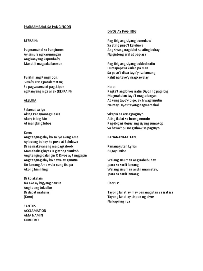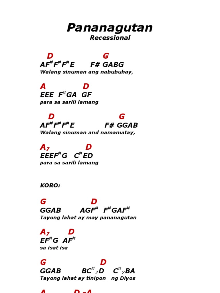 5102020 Pananagutan Tagalog Lyrics by Fr. G D A7 D Tayong lahat ay may pananagutan sa isat-isa. Tayong lahat ay may pananagutan sa isat isa Tayong lahat ay tinpon ng Diyos Na kapiling nya Sa ating pag mamahalan at panglilingkod kay kanino man Tayo ay magdadala ng balita na.
