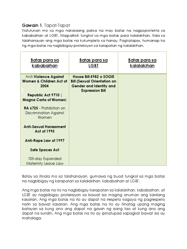 Ang librong ito ay una sa serye ng Handbook ng mga Batas para sa mga Katutubong Kababaihan na naglalaman ng Indigenous Peoples Rights Act IPRA Batas Republika Blg. 382018 Aniya may mga batas na nagbabantay sa karapatan ng kababaihan pagdating sa pag-a-apply sa trabaho tulad ng mga labor code at ang Republic Act 6725. Panukalang batas kontra diskriminasyon sa LGBT aprubado na sa 2nd reading By Kabie Aenlle September 14 2017 - 0234 AM Lusot na sa ikalawang pagbasa ang House Bill 4982 o o SOGIE Equality Act na panukalang batas na pagpapataw ng parusa sa diskriminasyon sa mga miyembro ng lesbian gay bisexual and transgender LGBT community.