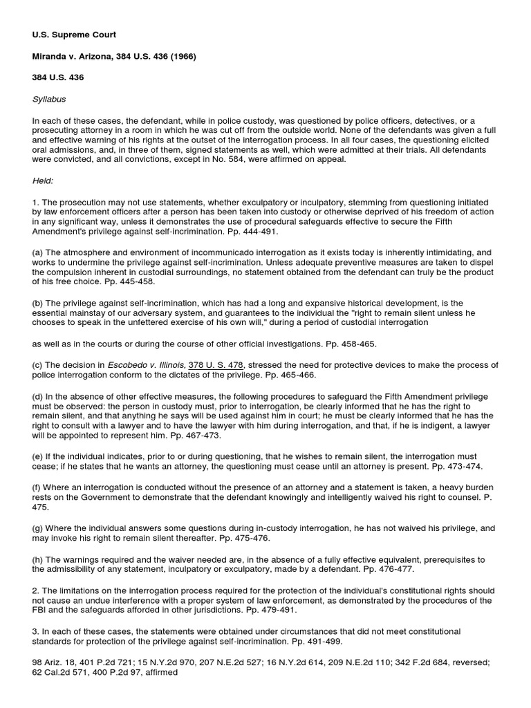 Day 10 Cases Miranda V Arizona Miranda Warning