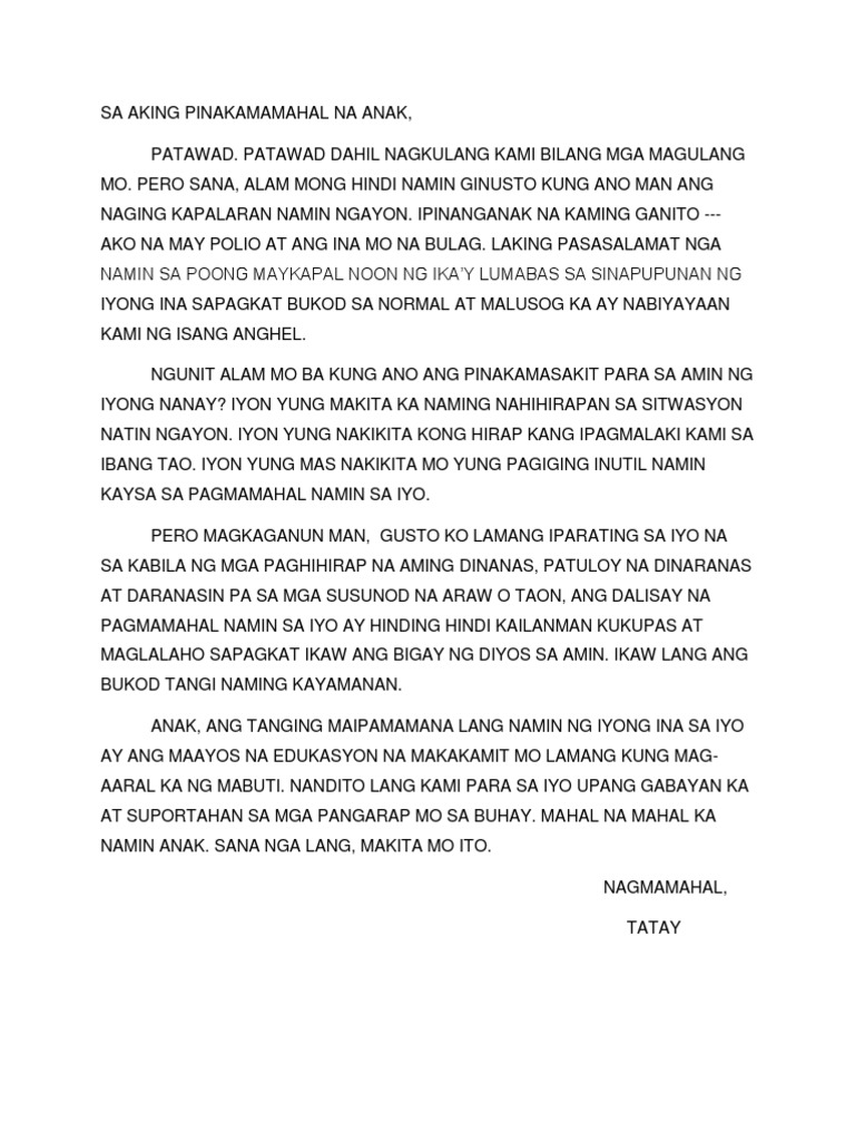 10112017 5Lagda Nakasaad dito ang pangalan ng sumulat. Kapag dala ng kalabuan ng mata ay nakabasag ako ng pinggan o nakatapon ng sabaw sa hapag kainan huwag mo sana akong kagagalitan. 2182020 Ikaw ay naging tunay na gabay sa buhay namin.