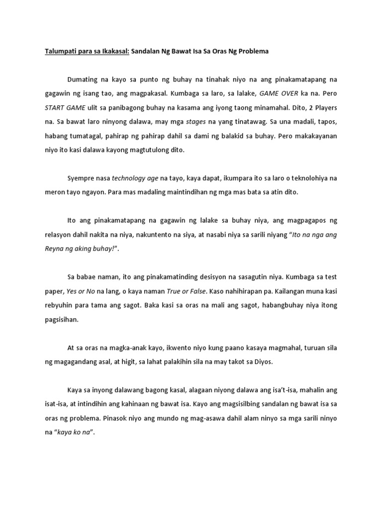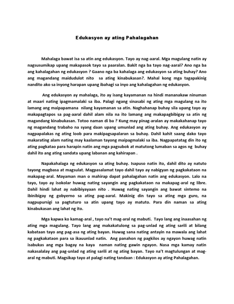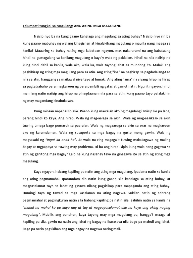Mapalad kayong mga bata na may mga magulang na laging nagbibigay patnubay sa lahat ng inyong mga gawain. Kahit anong paksa ay pwede mong gawan ng talumpati. Mga Talumpati Filipino Speeches Ang talumpati ay isang buod ng kaisipan o opinyon ng isang tao na pinababatid sa pamamagitan ng pagsasalita sa entablado para sa mga pangkat na mga tao.