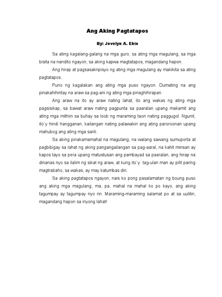 Lahat ay ginawa para kami ay mapasaya. Ang karangalan sa pagtatapos ay regalo natin sa ating mga magulang. Sa aking mga magulang kayo ang nagbigay buhay sa akin.
