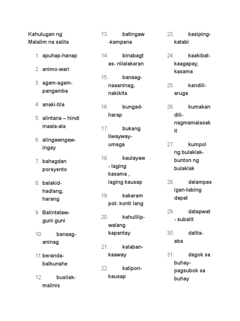 1 question Mga malalalim na salita para sa tula. Kung magbabalik ka man sinta. View Mga Malalalim Na Salitang Filipino At Ang Mga Kahulugan Nito1 as PDF for free.