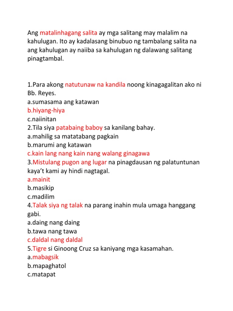 Ang Matalinhagang Salita Ay Mga Salitang May Malalim Na Kahulugan